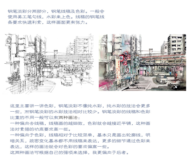 這里主要講一講色彩,鋼筆淡彩不像純水彩,純水彩的技法會更多一些,而鋼筆淡彩的水彩技法相對比較少。鋼筆淡彩的線稿和色彩比重的不同一般可以有兩種畫法: